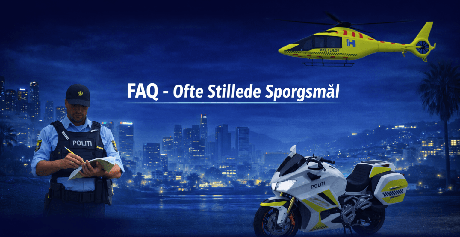 🚓 Som politibetjent er du med til at opretholde lov og orden i byen. Rollen kræver ansvar, overblik og god kommunikation. Du vil blandt andet arbejde med: 🚓Patruljering og udrykning 🚓Efterforskning og rapportskrivning 🚓Samarbejde 🚓Ranksystem efter kvalifikationer 🚑Som læge, paramediciner eller ambulancepersonale er du ansvarlig for borgernes helbred. Opgaverne kan bl.a. være: 🚑Akutte udrykninger 🚑Behandling af skadede borgere 🚑Samarbejde med politiet ved hændelser 🚑RP på hospitalet og i marken 📋 Ansøgning & Optagelse: Alle beredskabsjobs er whitelistede og skal ansøges via formularer ingame. Det er ikke jobs, man får med det samme – det er noget, man RP’er sig til gennem engagement, adfærd og interesse.